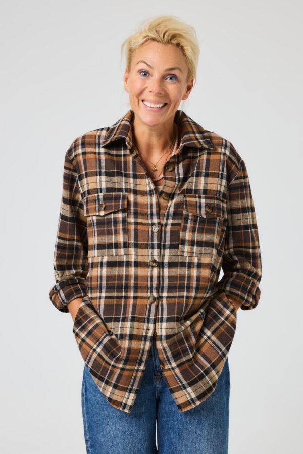 Den klassiske ternede skjorte er udført i en slidstærk bomuldsblanding, der føles blød mod huden og samtidig holder formen. Den lige pasform giver et afslappet look, og de gennemarbejdede detaljer gør den nem at style både åbent over en top eller lukket for et mere rent udtryk.