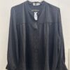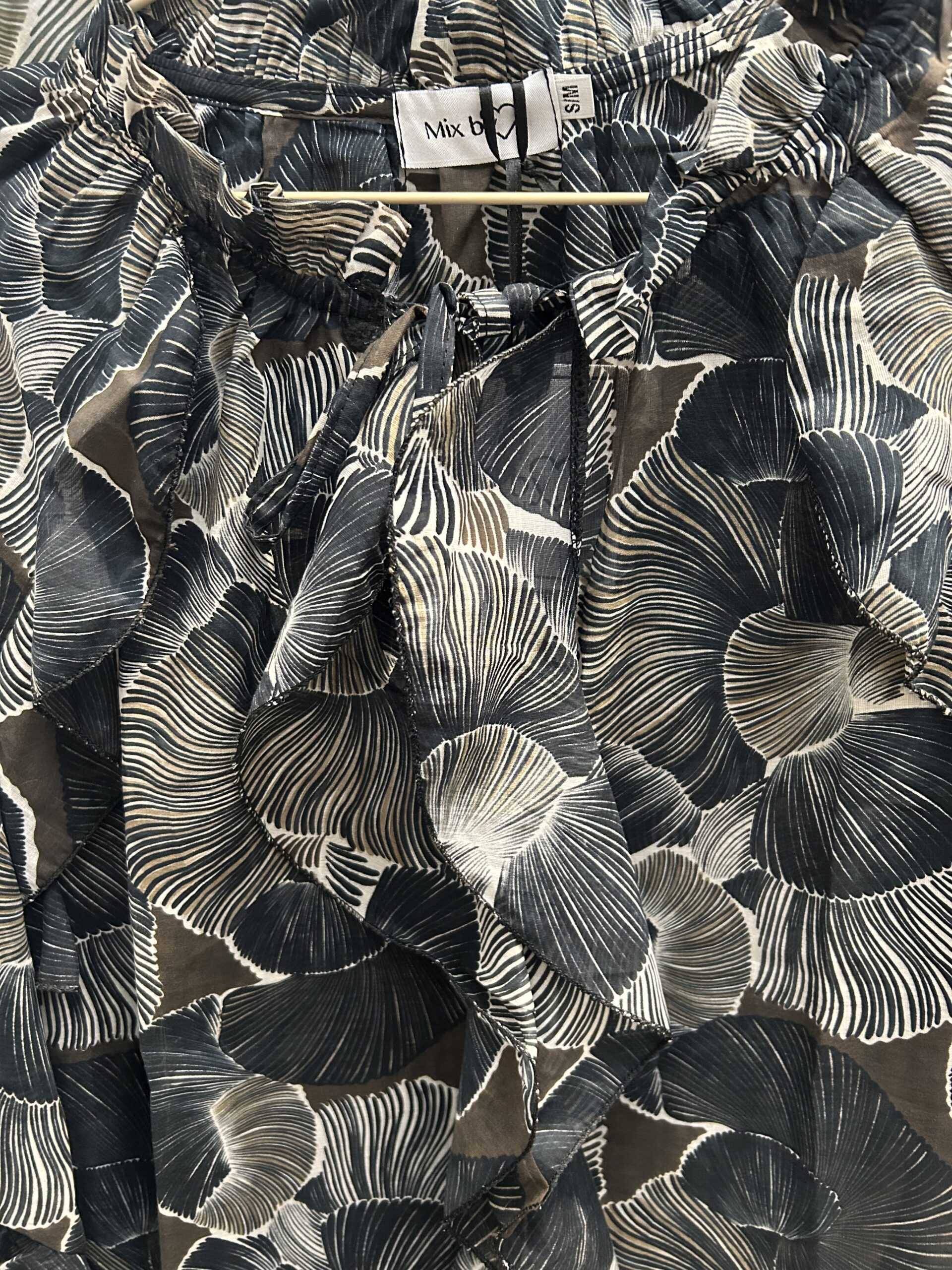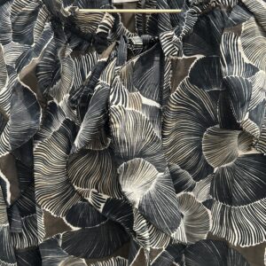 Bluse m/blad mønster i sort/ grå farver…..flæse foran m/bindebånd – flæse v/ ærme