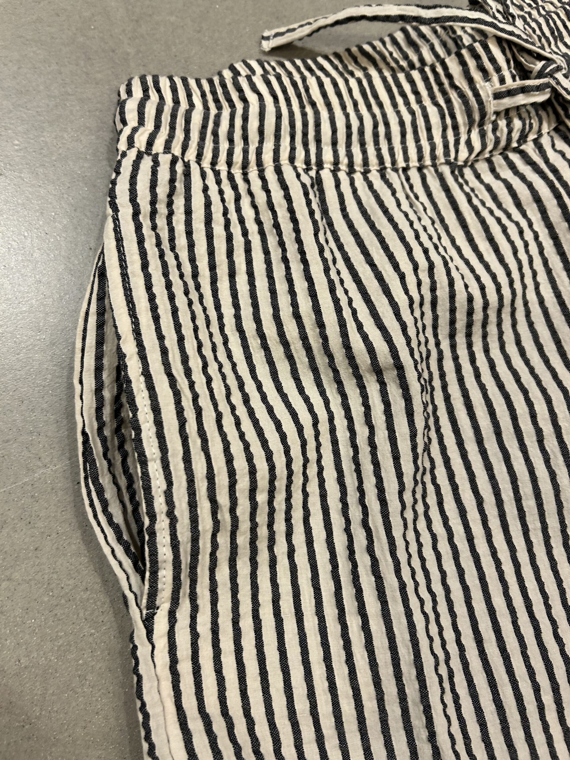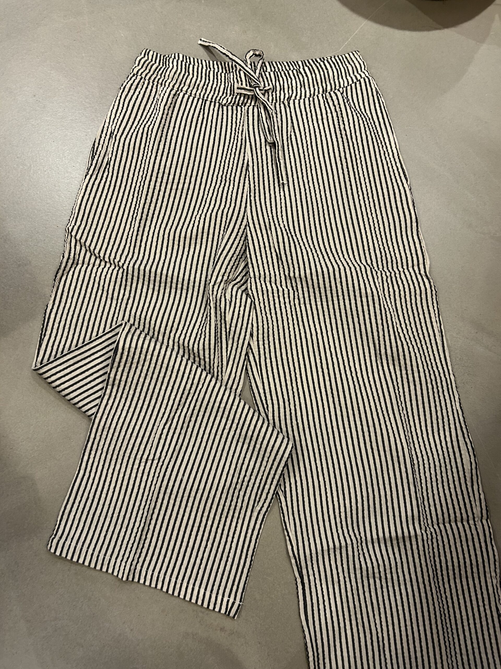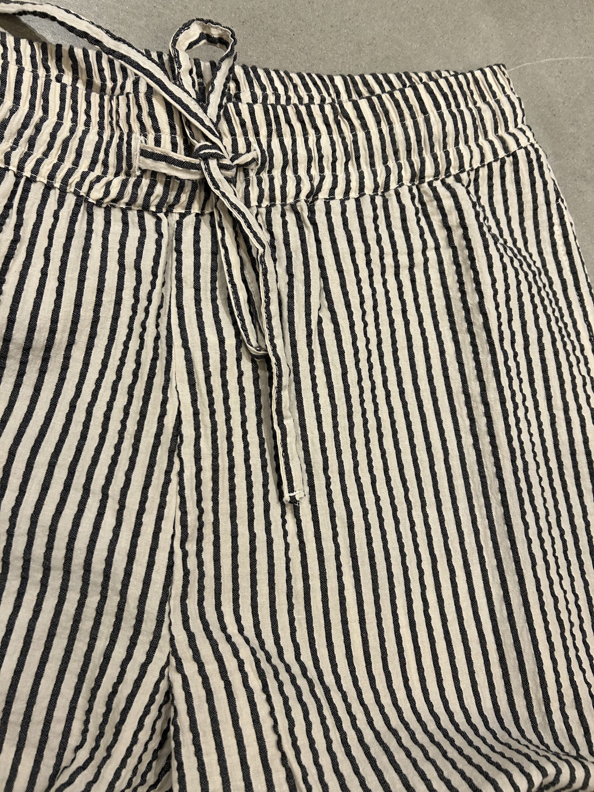 Buks m/striber i blød bomuld… skrå lommer og elastik i taljen samt bindebånd….