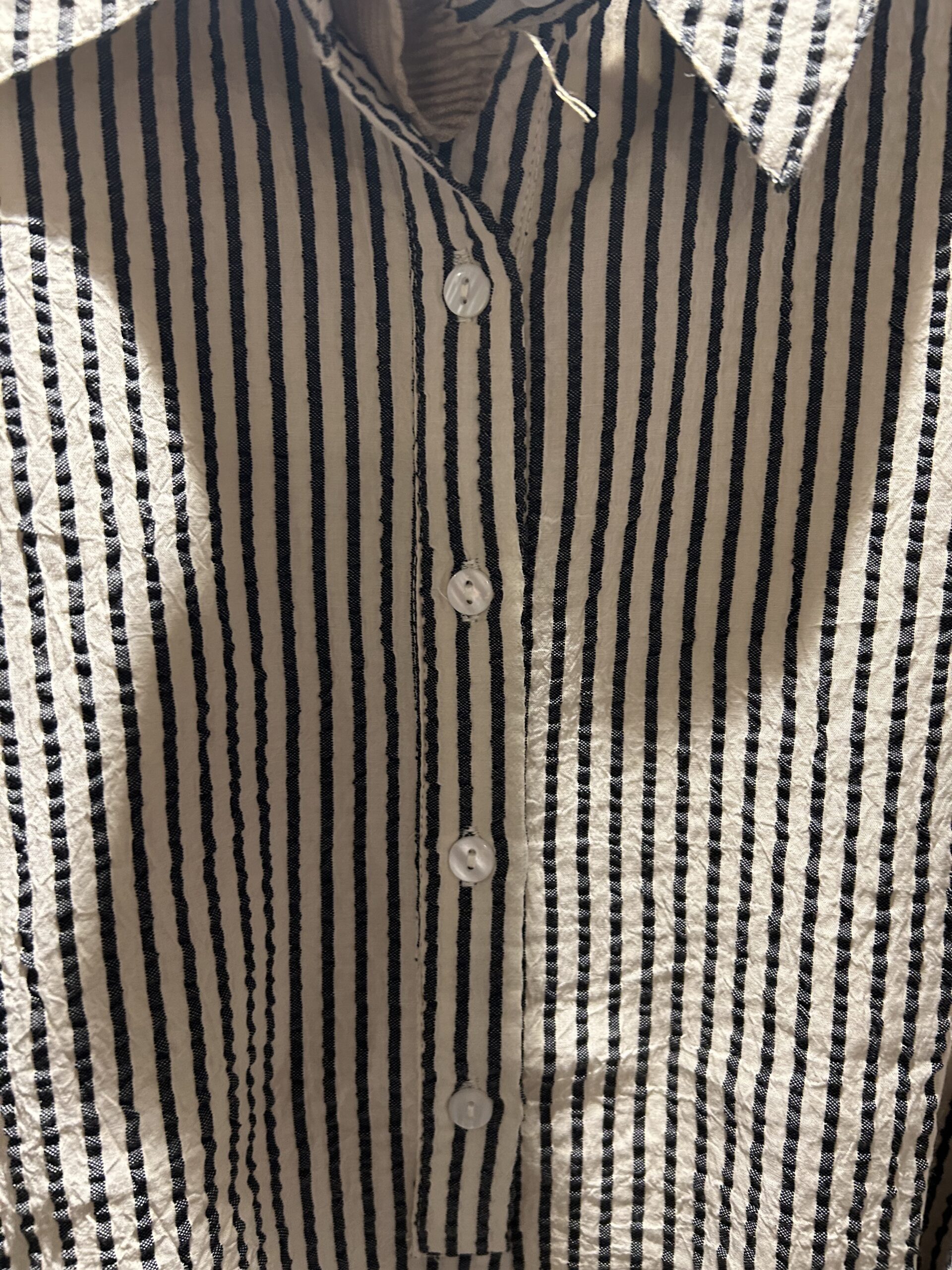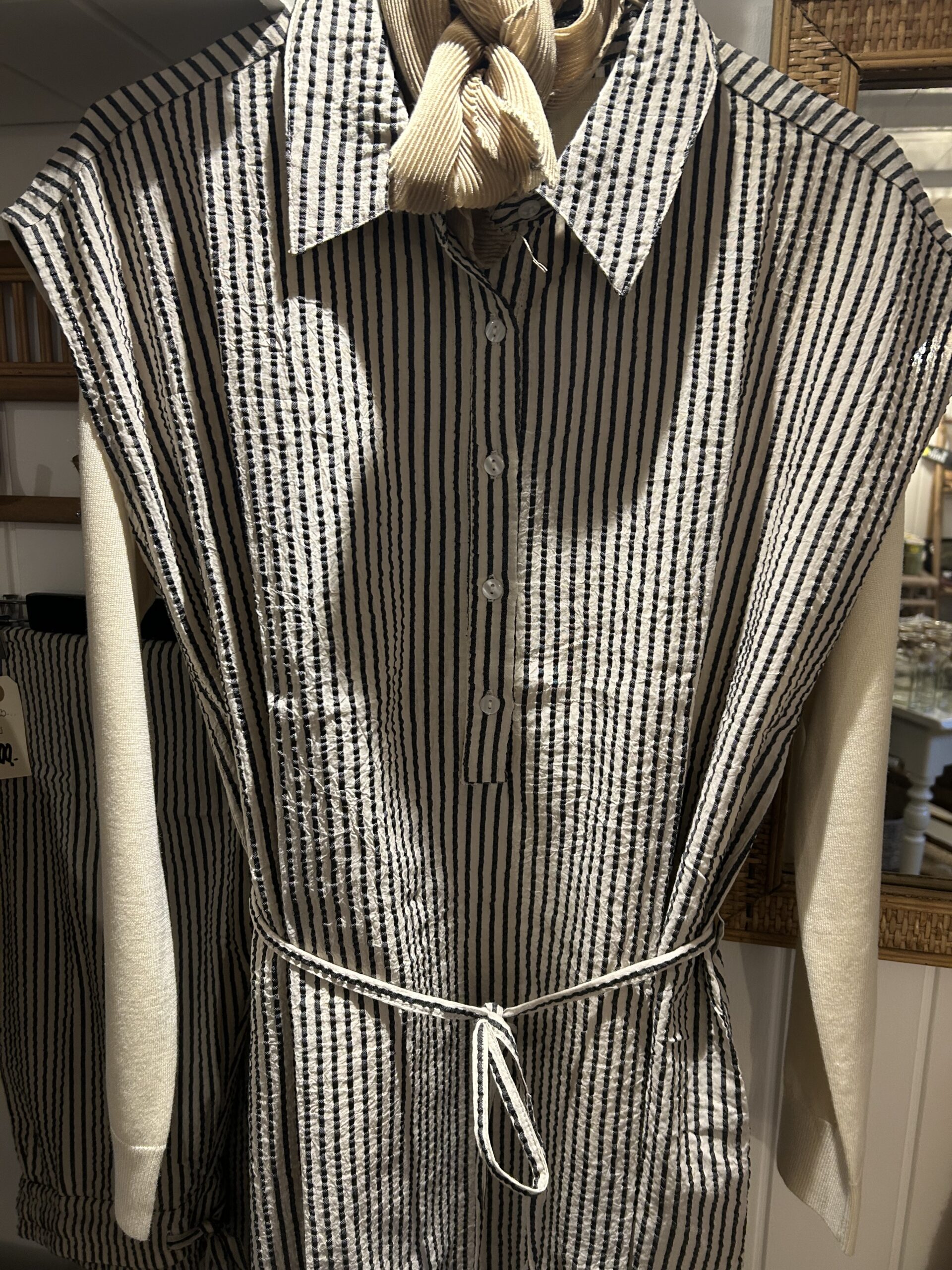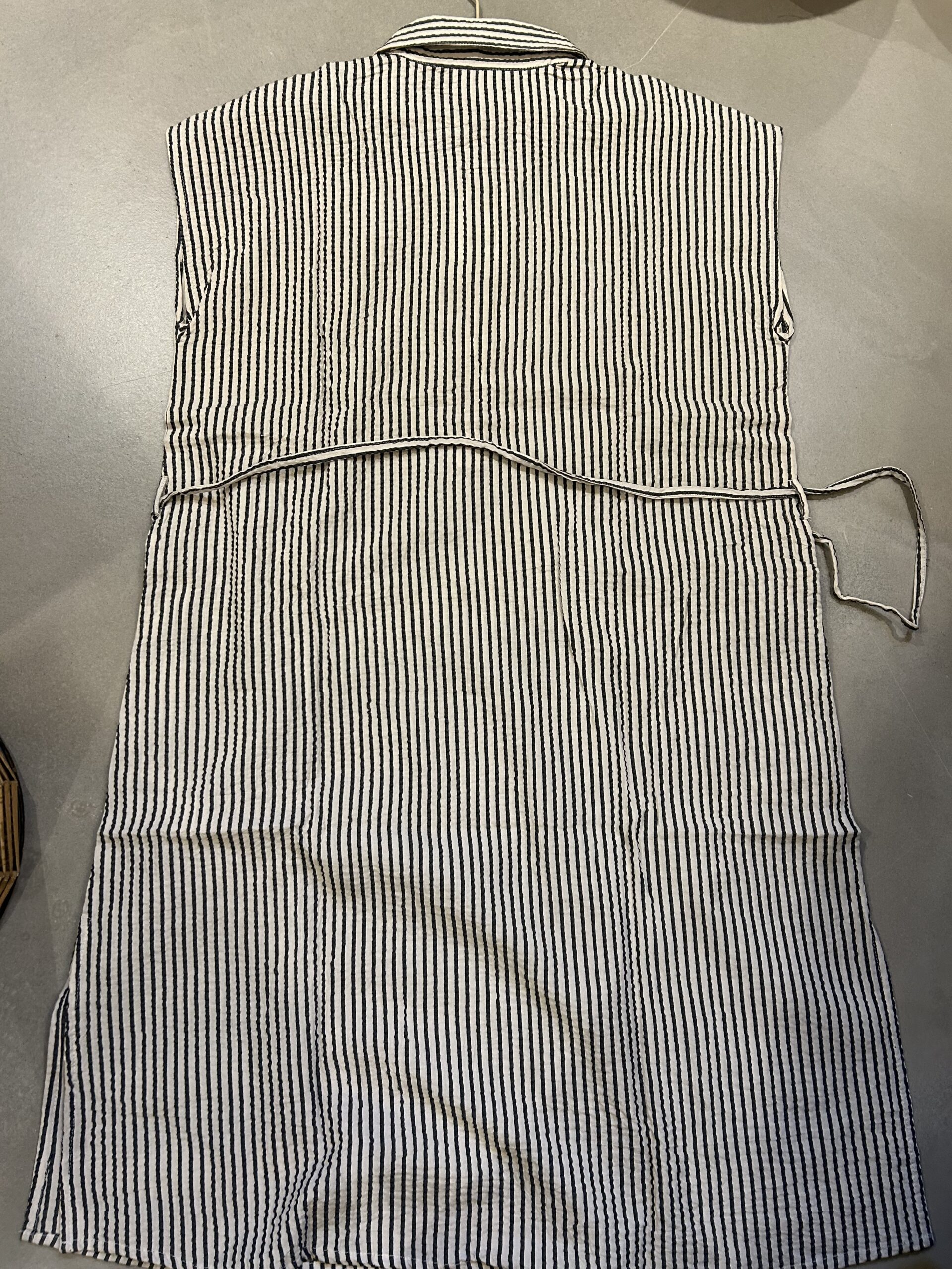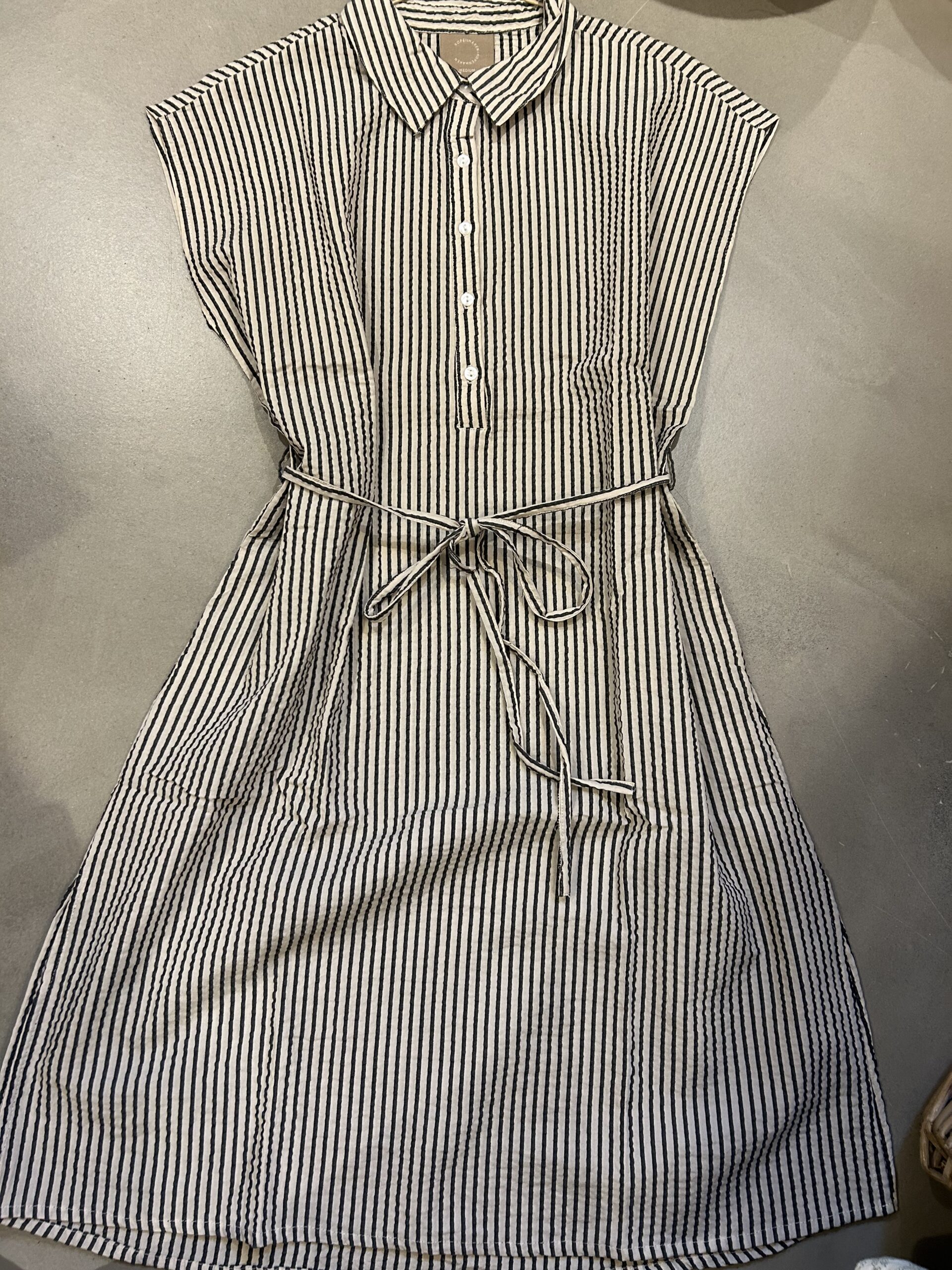 Løs kjole u/ærme m/ bindebånd i striber….lille krave og knapper…