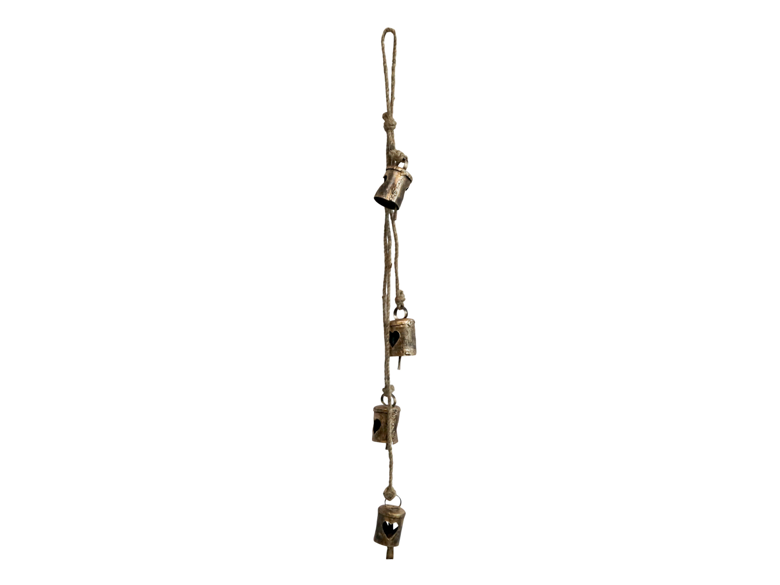 4 klokker med hjerter i antique messing på jutesnor….lige til at hænge op til JUL