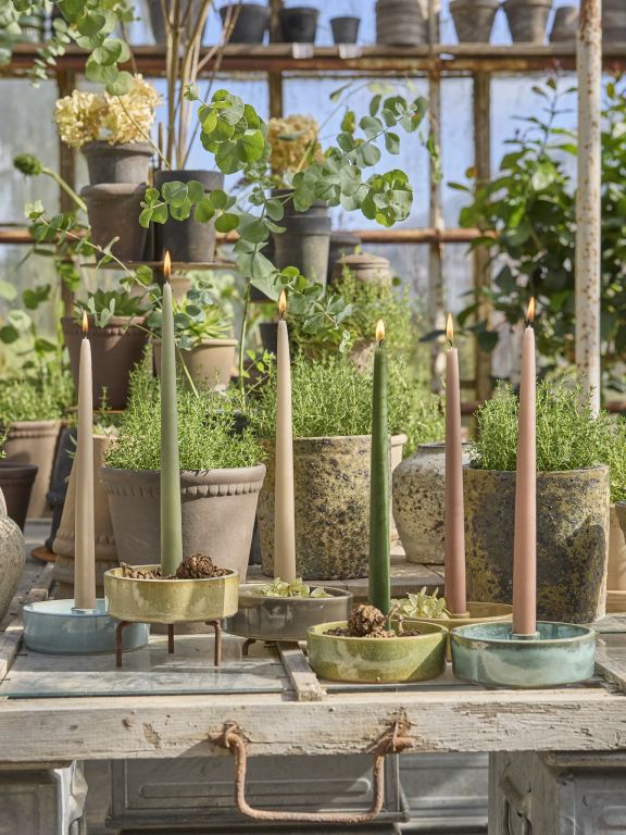 Lange flotte hånddryppede stearin lys i mange farver fra B-GREEN, brændetid 11 timer pr lys