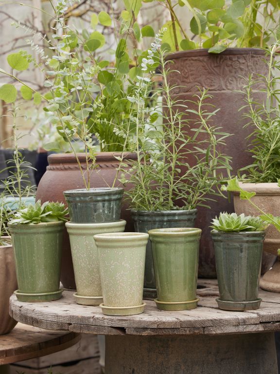 Glaserede krukker fra B-GREEN til inde eller ude….findes i flere str og farver,,, de kan være brændt forskelligt så 2 er ikke helt ens