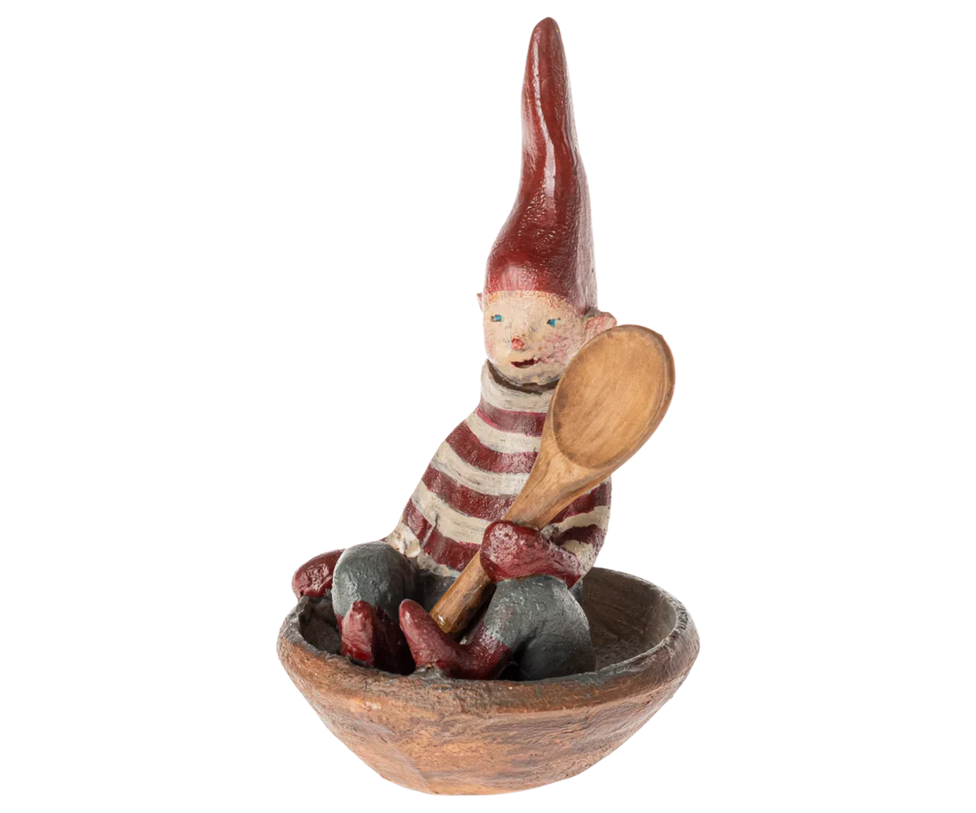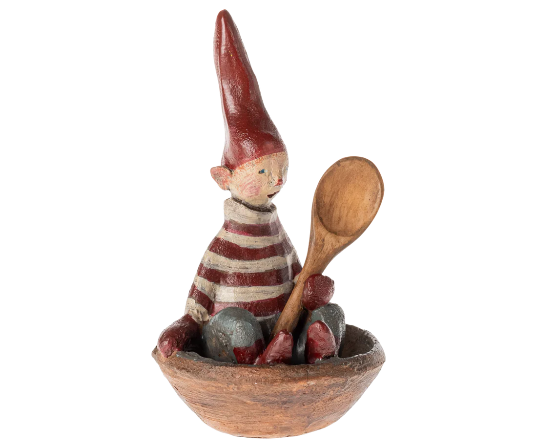 Lille nisse i skål som er klar til risengrøden….