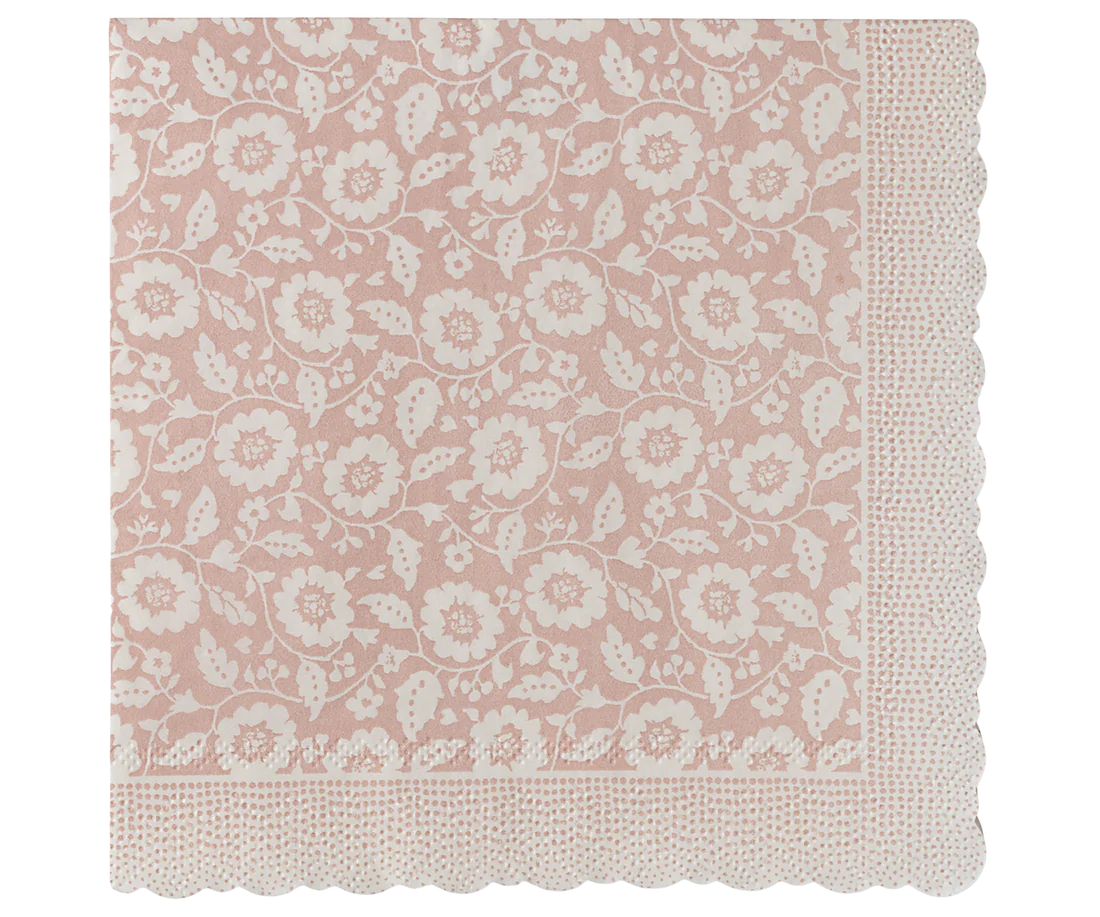 Servietter i rosa m/ blomster og bølget kant..