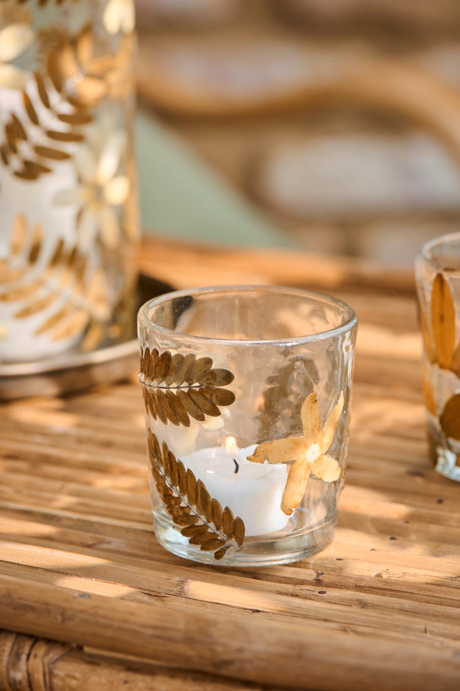 Dekorativ fyrfadslysestage i glas med friske blomster og blade, der tilføjer et naturligt og farverigt touch. De naturlige elementer kan blegne eller ændre farve over tid, hvilket bidrager til en smuk og organisk forandring. Ideel til at bringe naturens skønhed ind i hjemmet.