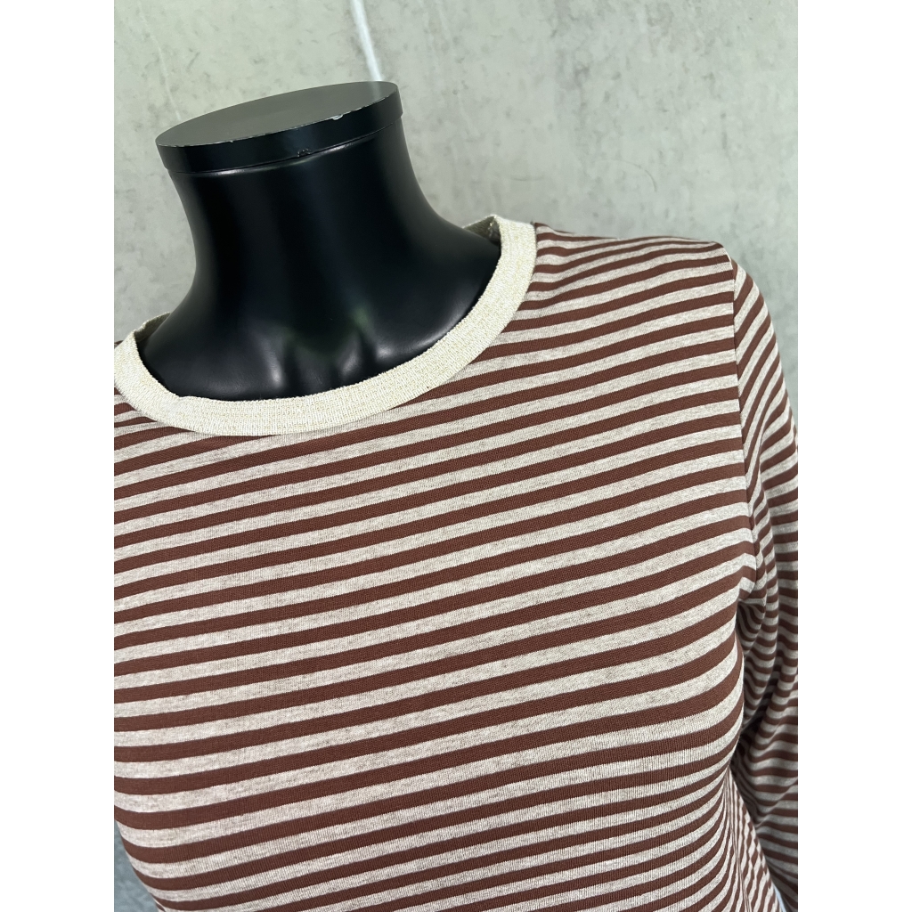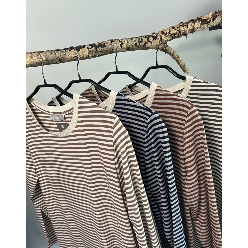 T-shirt med striber i beige melange….sød hals kant m/lidt guld glimmer