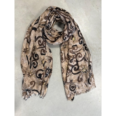 Blødt langt tørklæde i brune farver m/blomst og guld tryk….